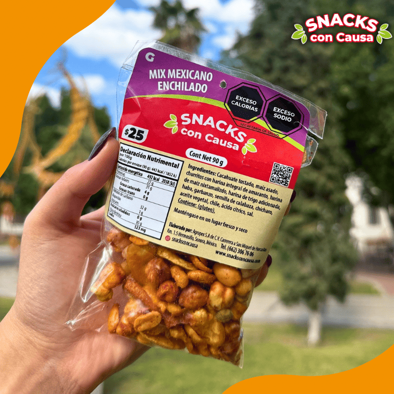 Ingredientes: Cacahuate tostado, maíz asado, churritos con harina integral de amaranto, harina de maíz nixtamalizado, harina de trigo adicionada, haba, garbanzo, semilla de calabaza, chicharo, aceite vegetal, chile, acido citrico, sal.